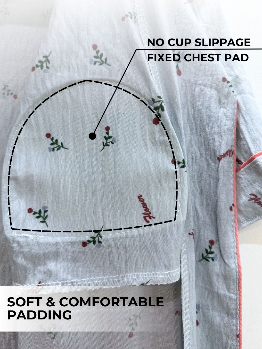 The fixed pads stay securely in place, ensuring all-night ease with no slipping or shifting. Lightweight and breathable, this nightsuit is perfect for winding down after a long day or starting your mornings in relaxed style. With the perfect blend of support, convenience, and chic design, it’s your go-to choice for comfortable yet stylish nightwear.