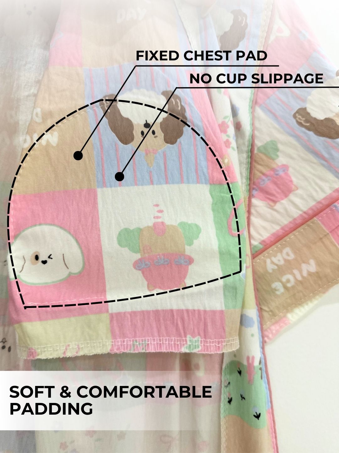 The fixed pads stay securely in place, ensuring all-night ease with no slipping or shifting. Lightweight and breathable, this nightsuit is perfect for winding down after a long day or starting your mornings in relaxed style. With the perfect blend of support, convenience, and chic design, it’s your go-to choice for comfortable yet stylish nightwear.
