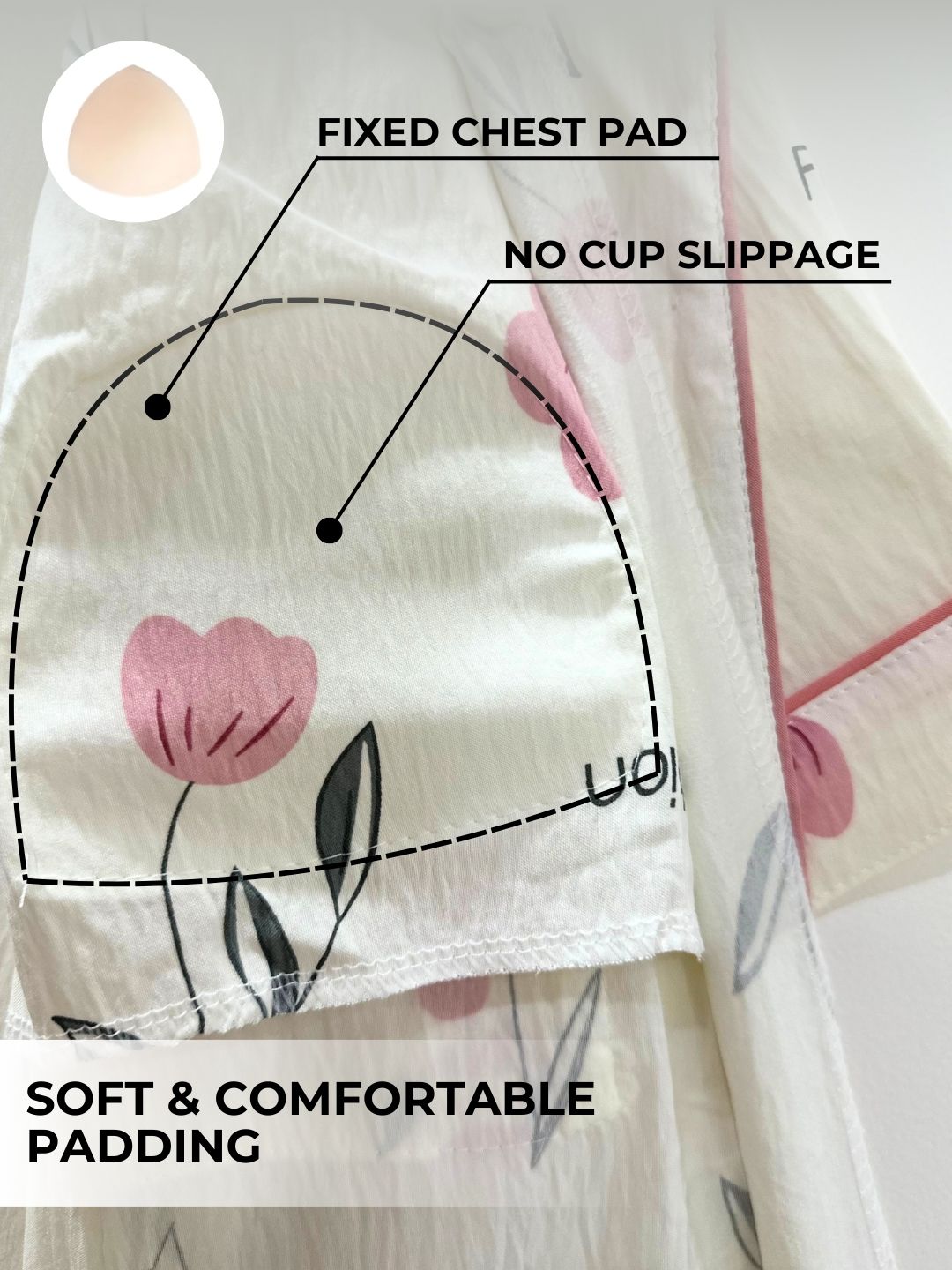 The fixed pads stay securely in place, ensuring all-night ease with no slipping or shifting. Lightweight and breathable, this nightsuit is perfect for winding down after a long day or starting your mornings in relaxed style. With the perfect blend of support, convenience, and chic design, it’s your go-to choice for comfortable yet stylish nightwear.