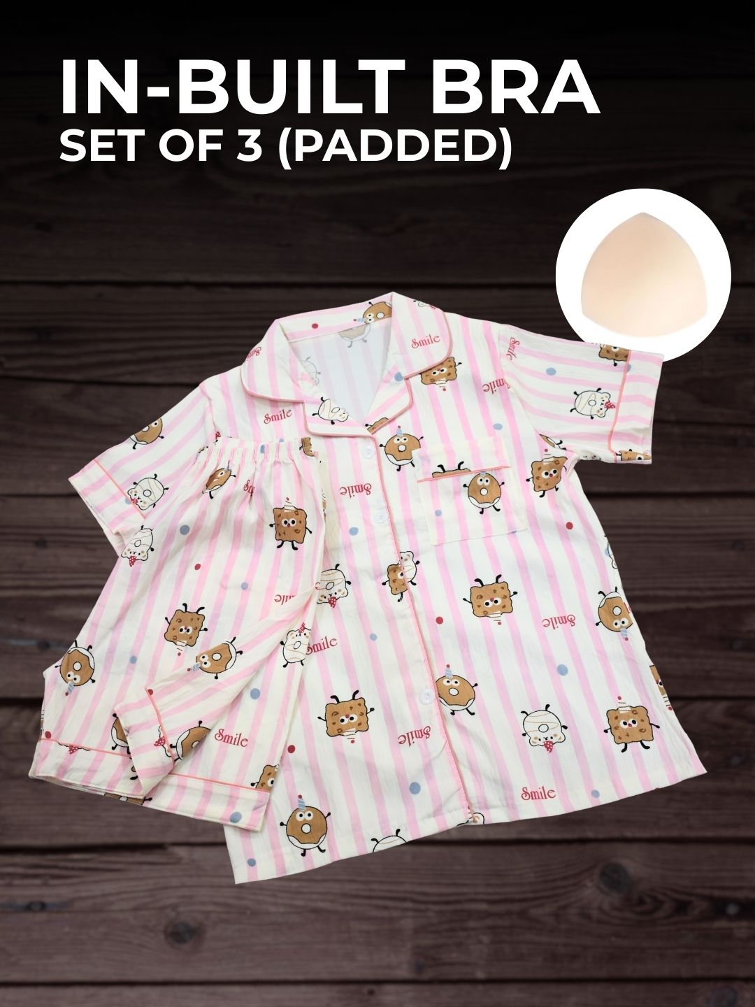 The fixed pads stay securely in place, ensuring all-night ease with no slipping or shifting. Lightweight and breathable, this nightsuit is perfect for winding down after a long day or starting your mornings in relaxed style. With the perfect blend of support, convenience, and chic design, it’s your go-to choice for comfortable yet stylish nightwear.