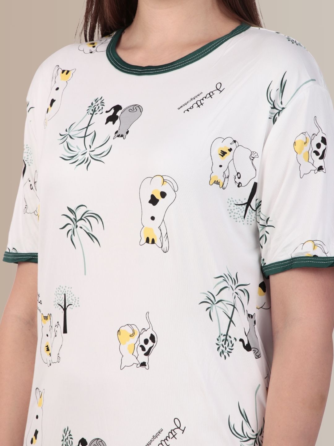 white nightsuit, cat nightwear, soft cotton sleepwear, stylish lounge set, breathable nightwear, cozy night suit, everyday home wear, trendy sleepwear, relaxed fit nightwear, casual nightwear, lightweight fabric, comfortable night suit, cute nightwear, soft fabric lounge set, printed nightwear set